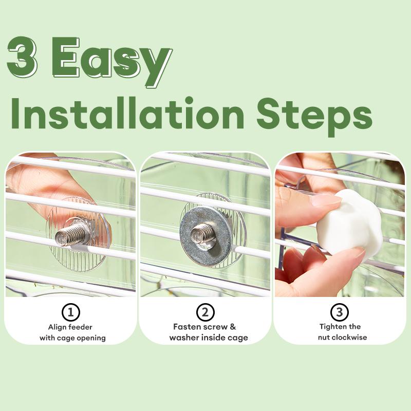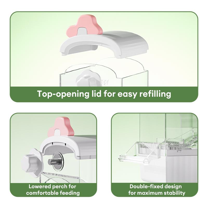 Dual-use for inside/outside cage mounting, it attaches firmly to all types of bird cages without taking up precious activity space. Easy to install and stable—won’t fall off or shake even when lively parrots peck hard. The high-transparency body lets you check the remaining food at a glance, no need to open the lid repeatedly for refills, hygienic and convenient.