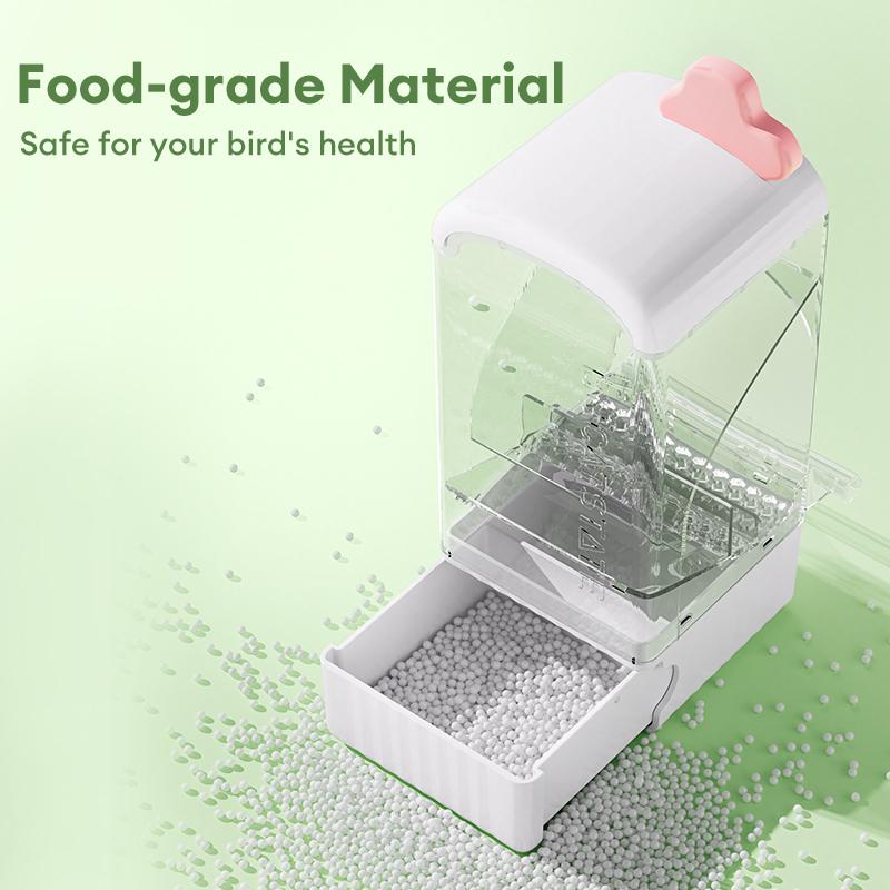 The large grain hopper holds enough food for your parrot for days with one refill, no more worries about food shortage during short trips. The funnel-shaped auto dispensing design releases food on demand, no jamming or overflow, eliminating the trouble of frequent refills.