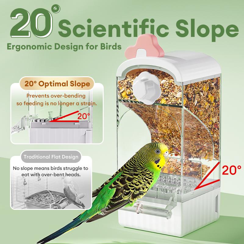 With a scientific baffle and precision food outlet, it fits parrots' natural pecking posture, effectively blocking feed splashes and reducing grain waste by over 80%. Say goodbye to the hassle of cleaning scattered feed crumbs in the cage—let your parrot eat in peace, and you clean with ease.
