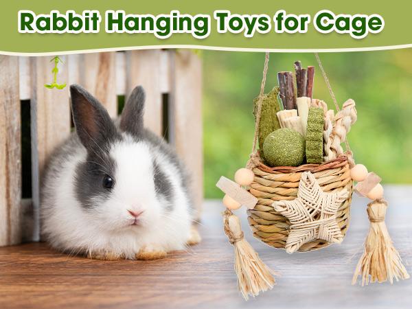Rabbit Chew Toys, Reed Grass Hanging Basket Chews, Woven Bunny Chewing Timothy Cake Wood Treats for Small Pets