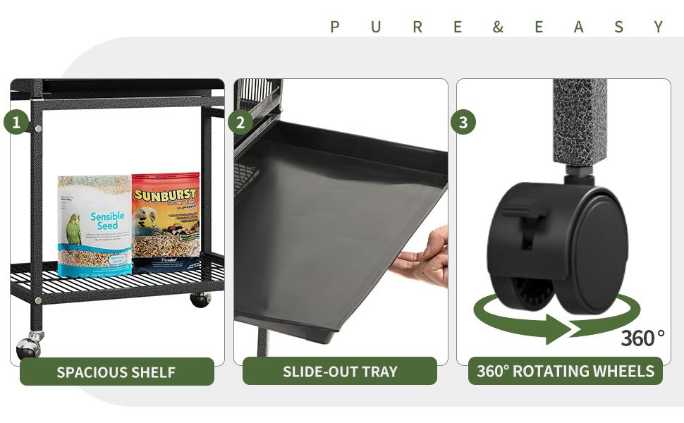 Easy to Move: 4 universal 360-degree swivel wheels are equipped so you can effortlessly relocate the bird cage quickly and safely; Spacious storage rack sits on wheels to grant ample space for pet supplies.