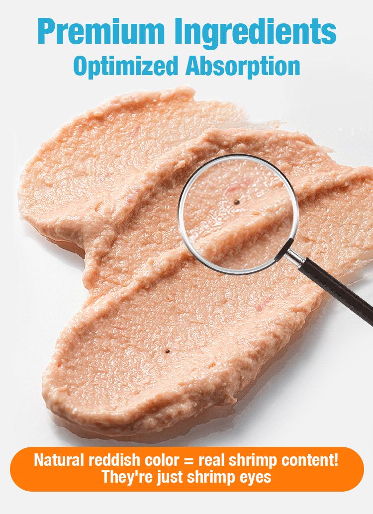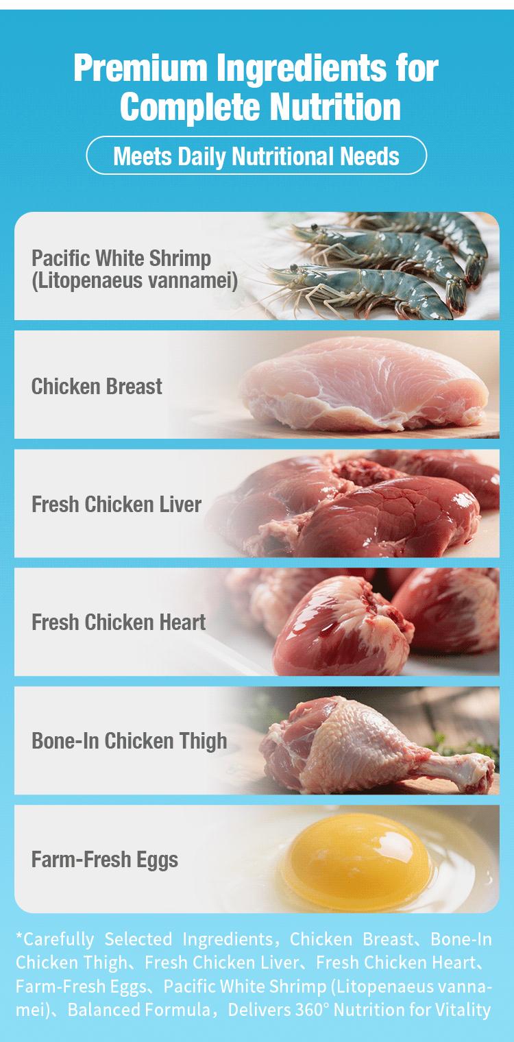 Crafted with fresh chicken, fish oil, and shrimp—every bite is packed with real, high-quality ingredients that even the pickiest cats can’t resist!Enriched with high-concentration Omega-3 from deep-sea fish oil, it supports shiny fur, vision health, and strong immunity. Made with no gums, no artificial attractants, and no preservatives, it’s gentle on sensitive stomachs and highly digestible (95% absorption rate). We use bone-in chicken thigh, liver, and heart to provide natural taurine, delivering complete daily nutrition for cats of all life stages.